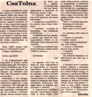 A címben szereplő név (mely egy tevékenység és a jövőbe tekintő csapatot takar) első látásra furcsának tűnhet, de ha megismerjük létrejöttének körülményeit, teljesen magától értetődővé válik. A teljes megnevezés ugyanis így hangzik: CsaTolna Egyesület a Tolna Megyei Internet Fejlesztéséért. A névadás körülményeiről álljon itt egy kivonat Cserháti Andrásnak, a CsaTolna Egyesület egyik alapítójának leveléből (teljes terjedelmében az interneten olvasható):