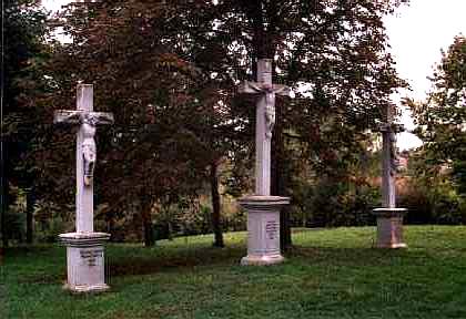 ![]() Grábóci keresztek. Az elsőn Szent Rókus és Szent Flórián szobrával